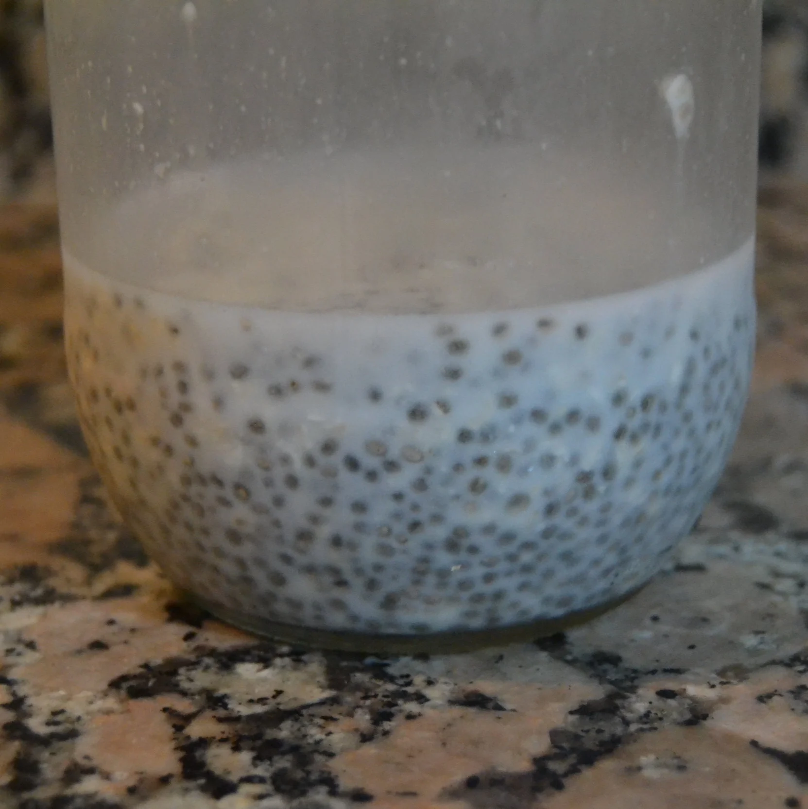 En un bote, mezclar la chía, la avena, el agua y la leche. Revolver un poco, y guardar en la nevera toda la noche.